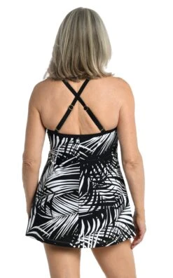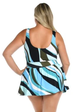 This D-cup shirred bandeukini with sweetheart neckline in midnight is a great addition to any wardrobe. The color block top features strips of green and blue with blue straps running along the low back cut. Built-in cups provide extra support to curvy women, while the fitted bodice provides enhanced fit and confidence.