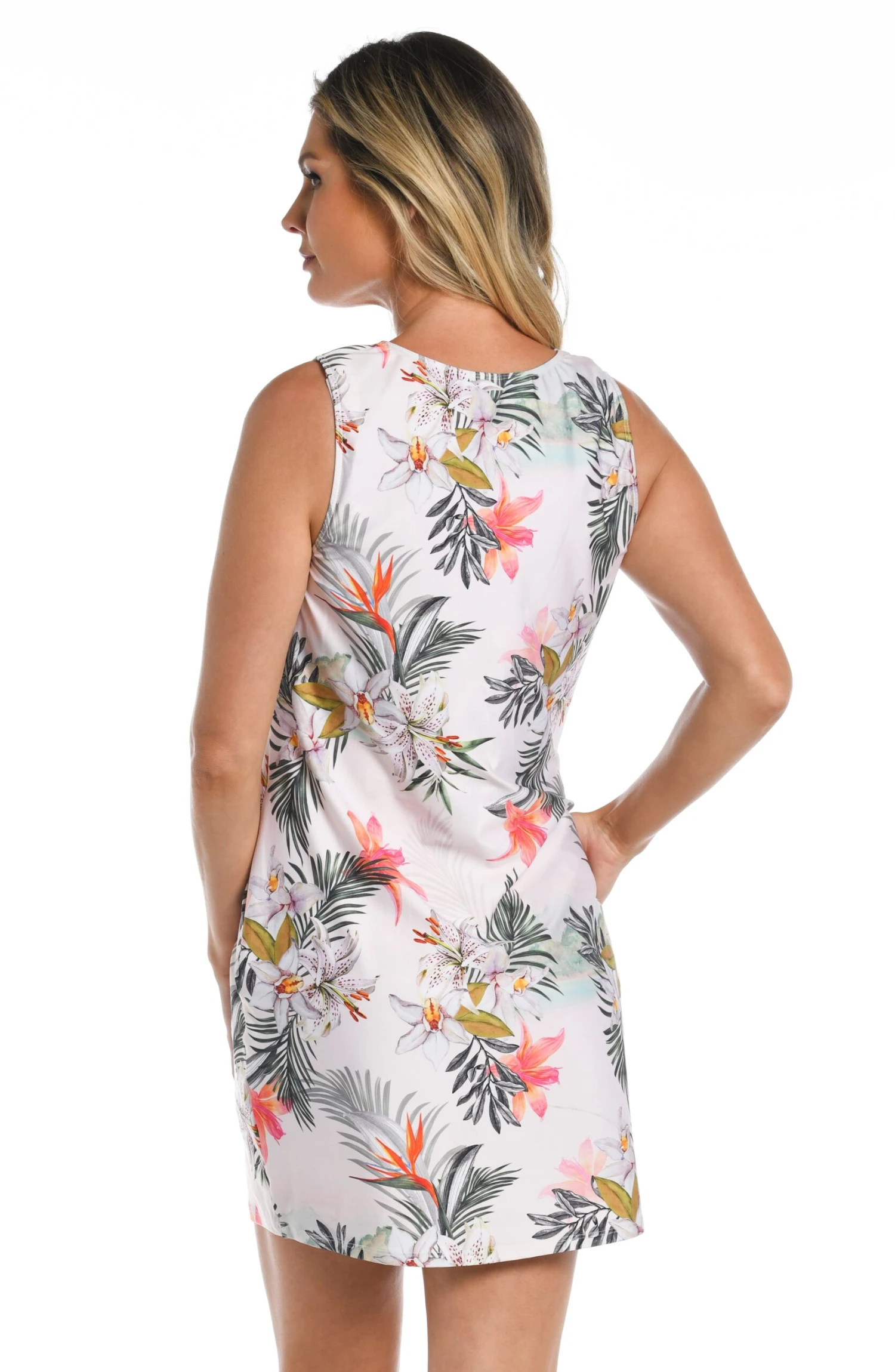 Featuring a beautiful breezy digital print, this sleeveless shift dress falls freely from the shoulders but is stitched to slightly accentuate the bust line, giving you an elegant look. It also features side pockets, which add to its convenience. What truly makes it stand out is the sun protection it offers. This gorgeous shift dress fabric has a UPF 50, allowing you to make the most of warm summer days without worrying about exposing your skin to harmful sun rays.
