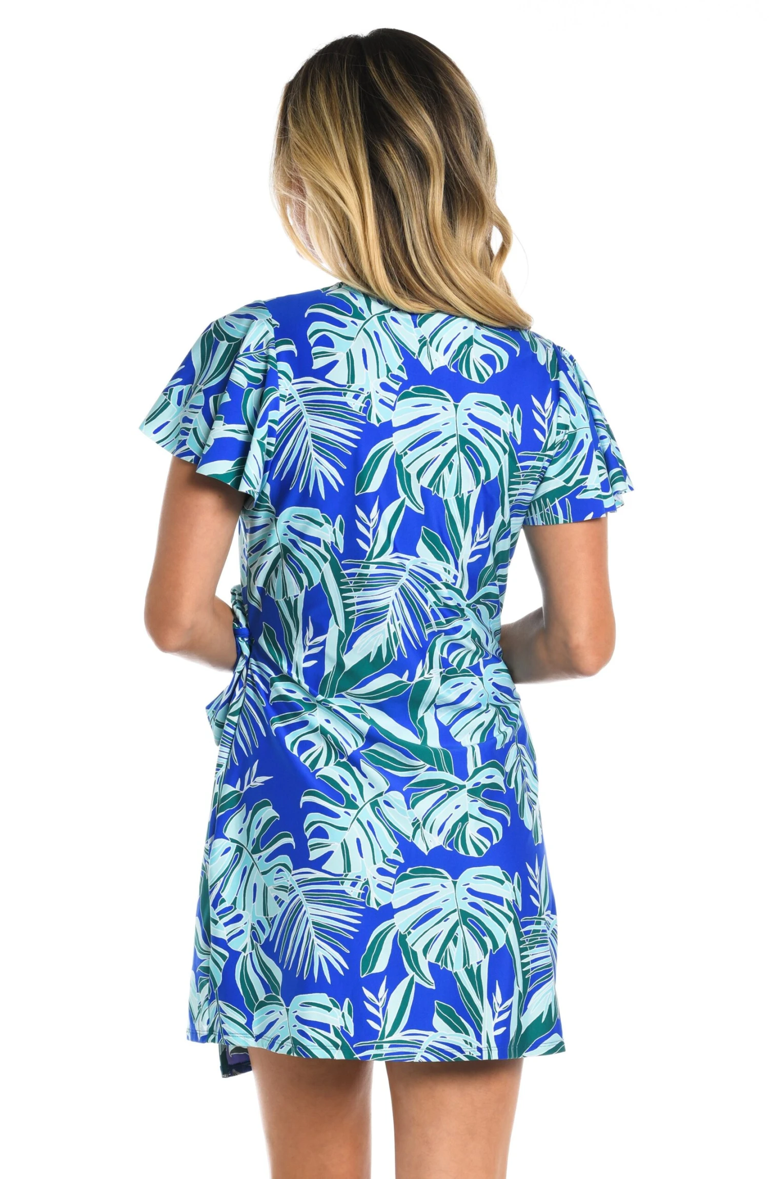 Add this flutter sleeves wrap dress to your wardrobe for a fun vibe. The flutter sleeves make you look feminine, while the deep V-neckline offers a flirty look. The beautiful light teal leafy print on deep sapphire makes it perfect for day or night. The dress hits the end just above the knees, so your legs appear longer.