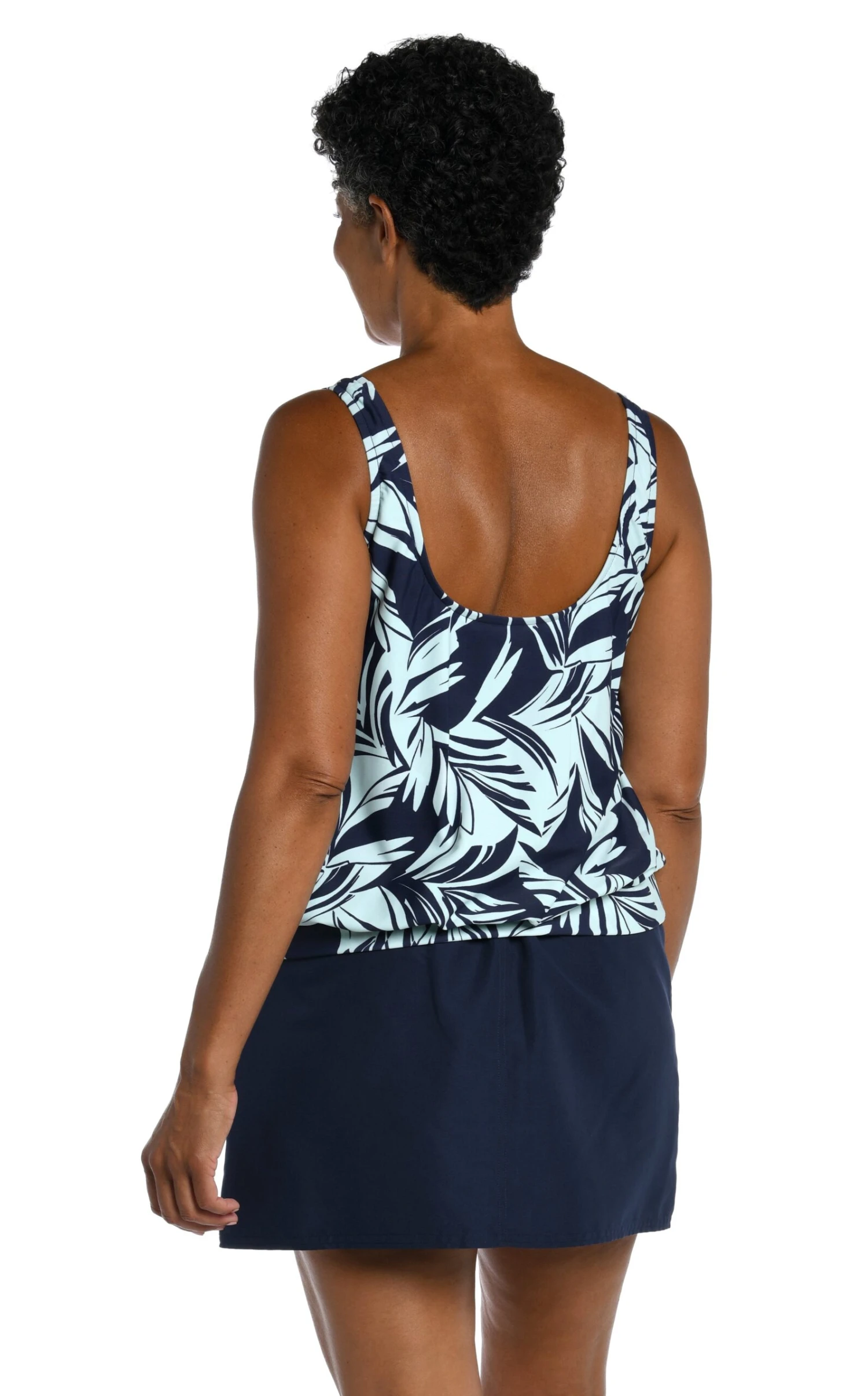 Palm fronds in a contrasting yet complementary blue hue offer a sophisticated update to the tropical-inspired print on this tankini. The loose-fitting blouson style masks the tummy area, while the side-tie detail adds a flirty touch. Built-in cups and over-the-shoulder straps lift and support the bustline.