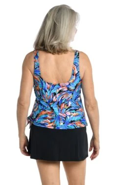 Palm fronds in a contrasting yet complementary blue hue offer a sophisticated update to the tropical-inspired print on this plus-size tankini. Ruffled layers create a loose, flowy fit that subtly disguises your stomach and waist, while a scoop neck and built-in cups flatter the bust.