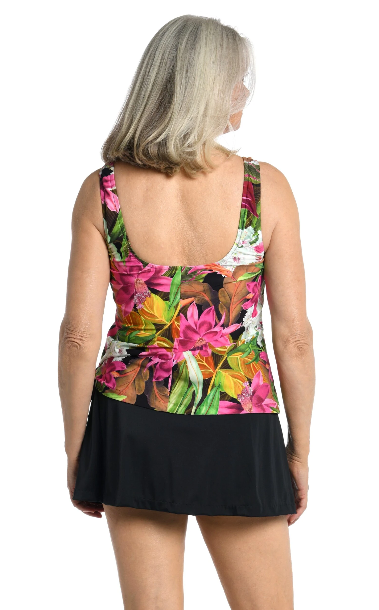 Show off your wild side in this one-piece suit inspired by the flora and fauna of the Amazon Rainforest. A side tie on the one-piece design creates the look of a tankini paired with a skirt. Built-in cups and a built-in tummy toner lift, support and smooth your silhouette.
