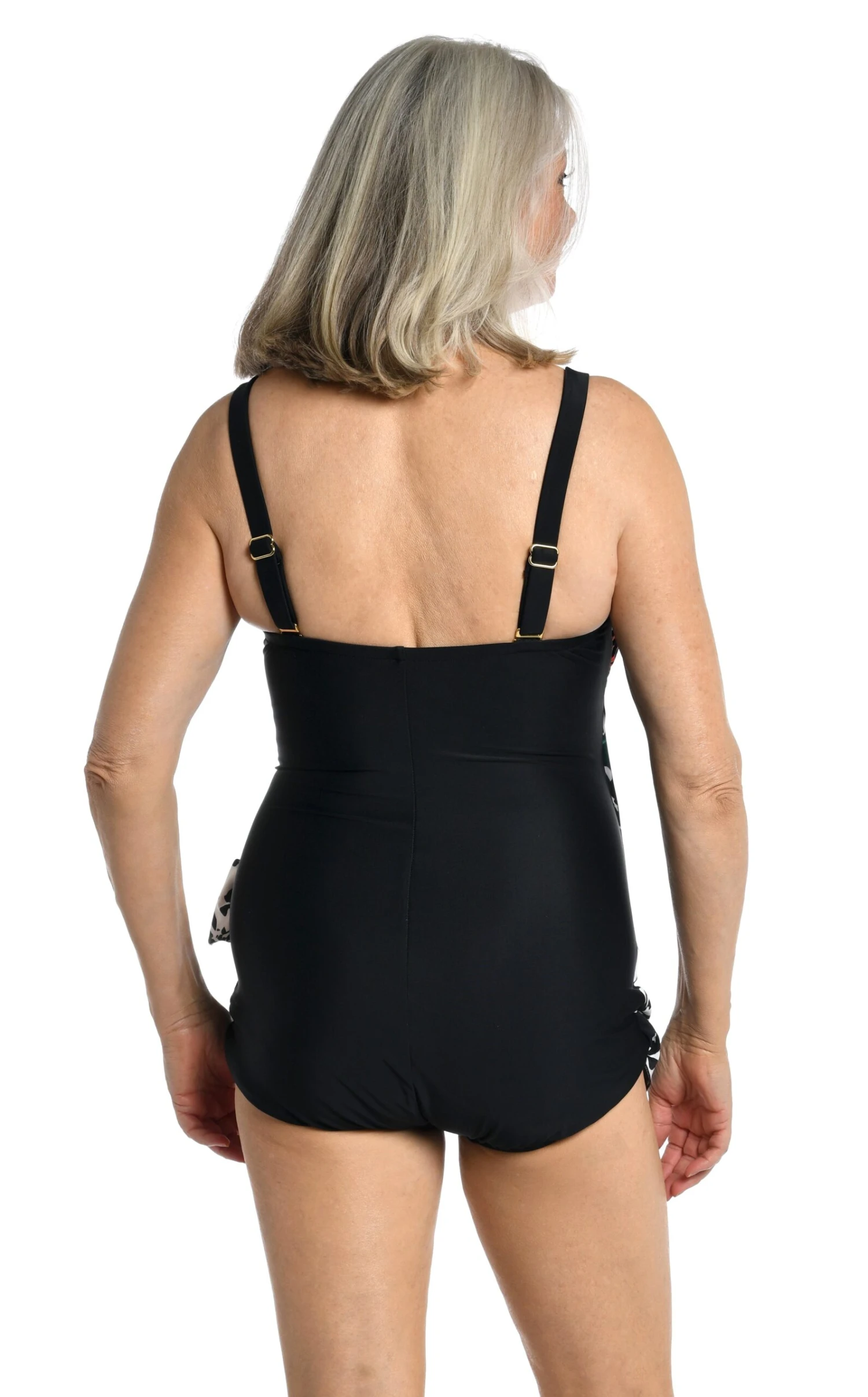 This gorgeous one-piece suit features an intriguing mix of color and pattern with a tossed bouquet of blooms that transitions to black and white with touches of blue. With a longer length for full coverage all the way around, it features a side-tie detail for a flirty touch. Remove the straps to transition the suit into a bandeau and eliminate those tan lines in the process.