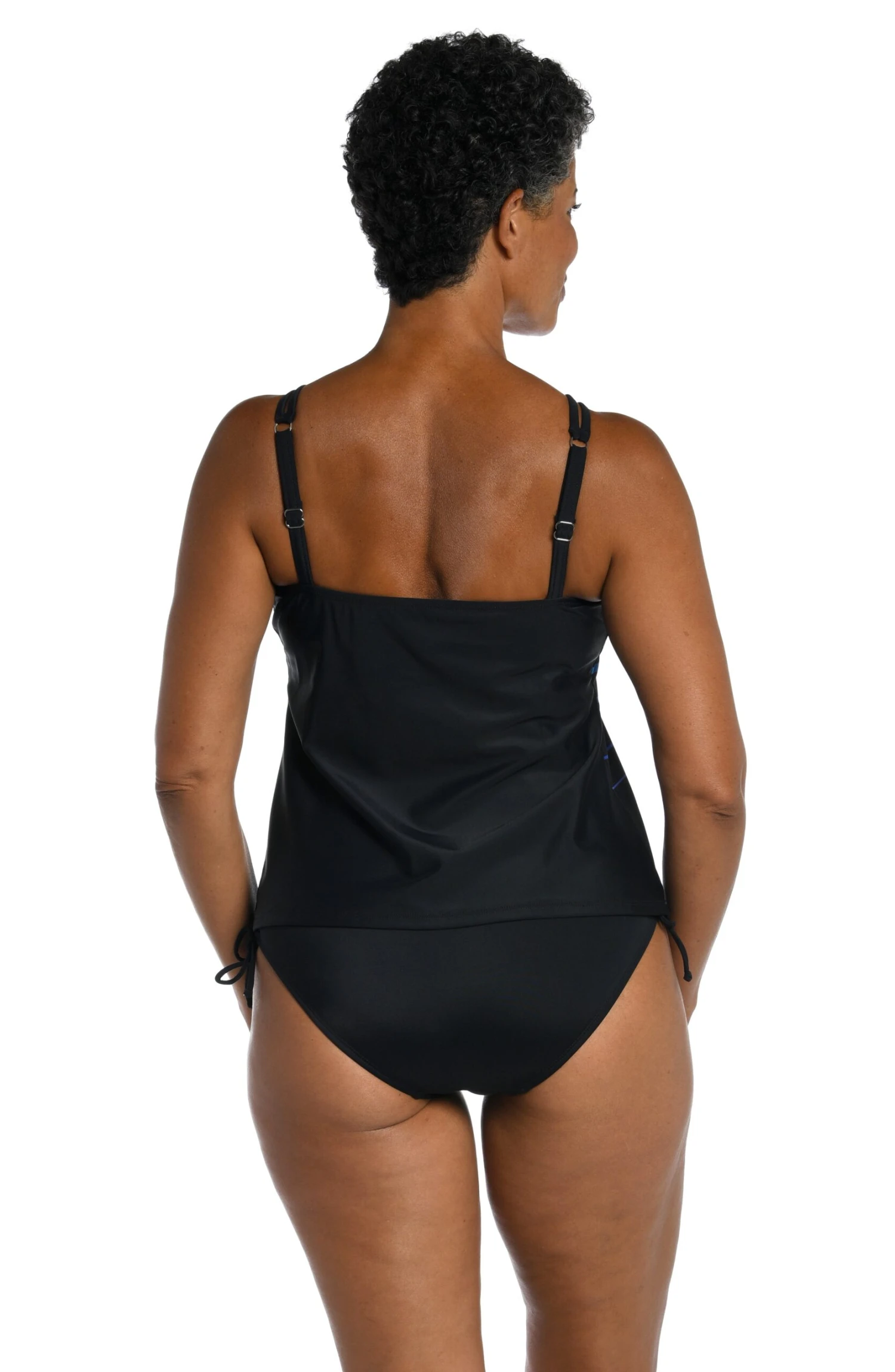 This tankini features sporty stripes in sea-inspired shades of blue that fade into solid black for figure-defining style. A high-neck design showcases your shoulders, drawing the eye upward to create a balancing effect. Part of the Maxine Movement collection, this suit delivers a higher level of chlorine resistance, shape retention and comfortable compression for a sleek silhouette.