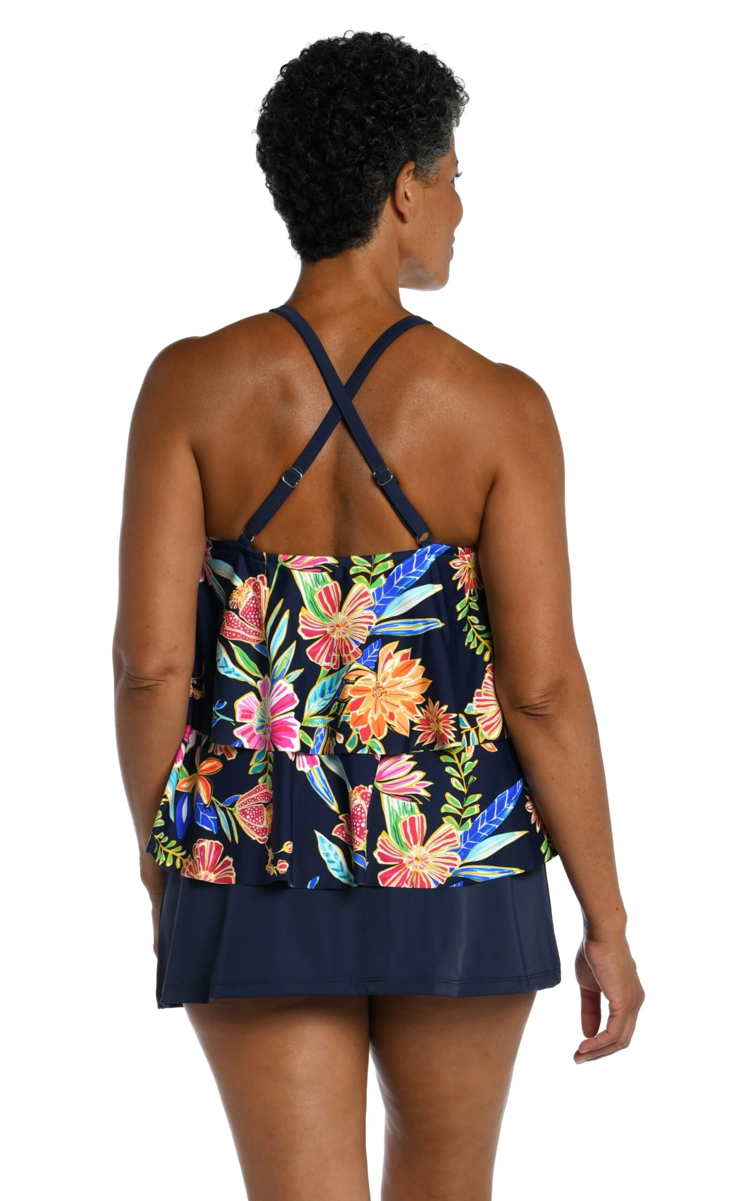 A garden’s worth of flowers in brilliant hues blooms against a canvas of indigo blue on this tankini. Ruffled tiers create a flowy fit that subtly hides your stomach and waist for a slimming silhouette. The high-neck style beautifully balances the shoulders for an ultra-flattering look.