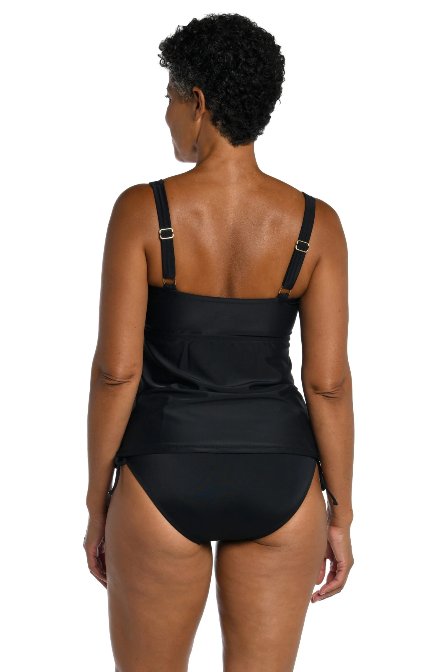 A bevvy of blooms in colorful combinations brings a pop of personality to this tankini. The overlapping bodice creates a sweetheart neckline that accentuates the bust. Allover shirring hides trouble spots, while solid black sides define the waistline.