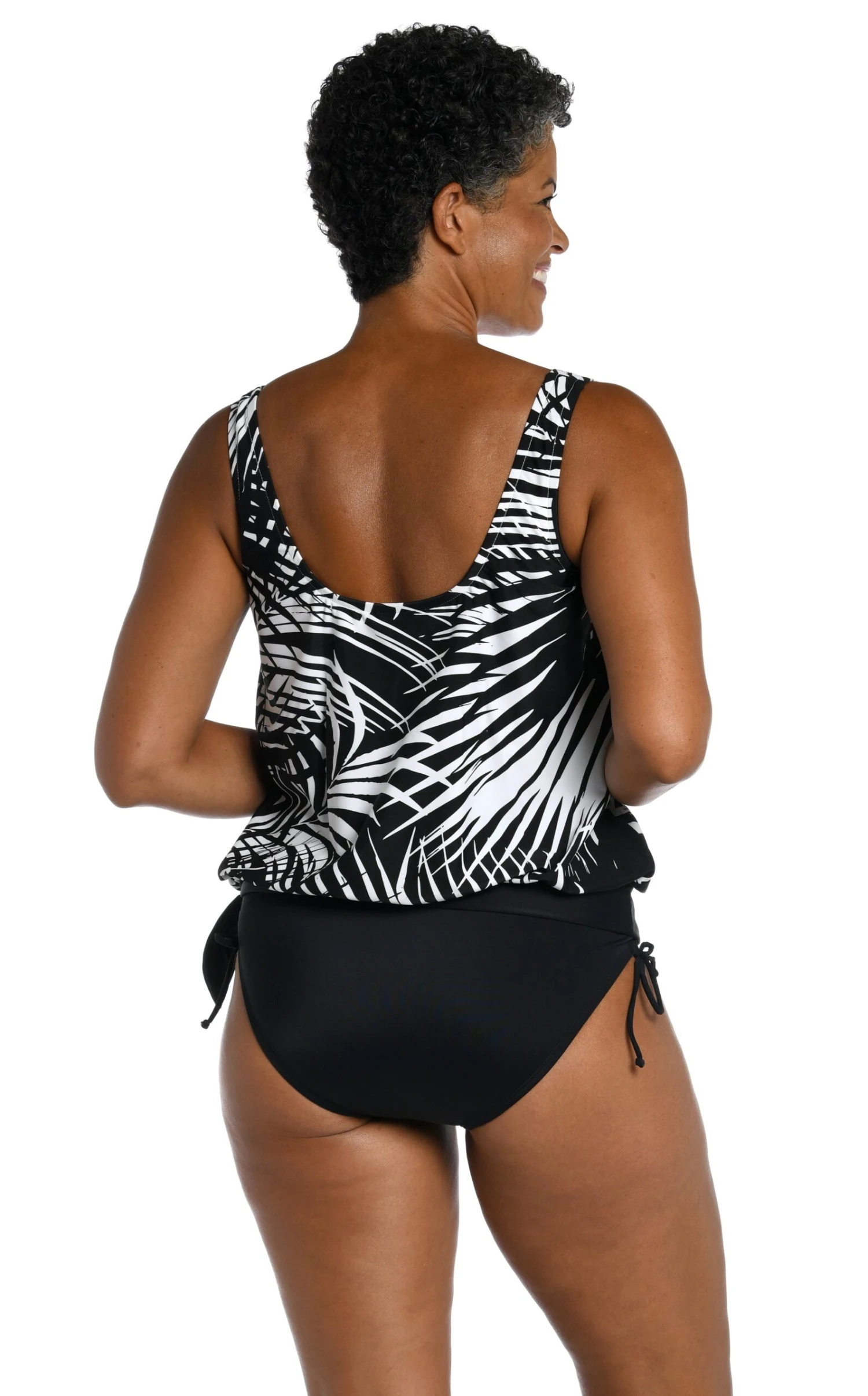 Palm fronds in black and white bring plenty of visual punch to this tankini for a sophisticated take on a tropical-inspired print. The loose-fitting blouson style masks the tummy area, while the side-tie detail adds a flirty touch. Built-in cups and over-the-shoulder straps lift and support the bustline.