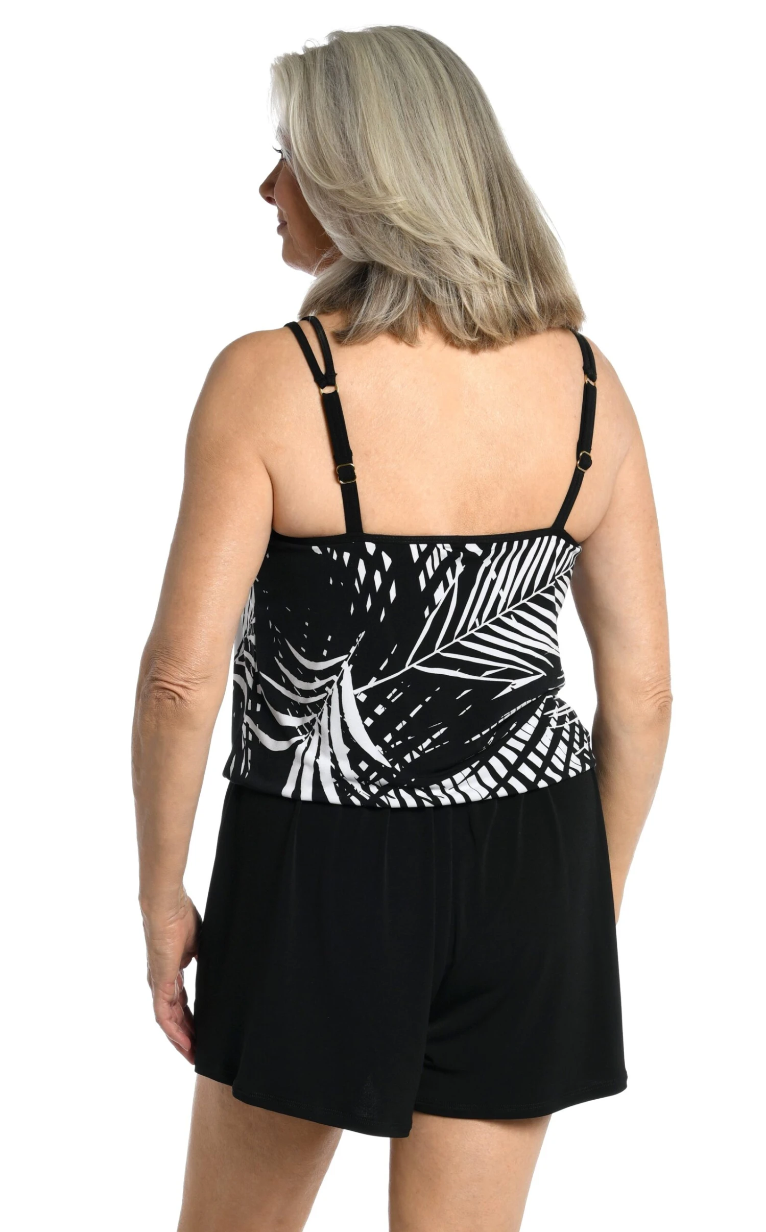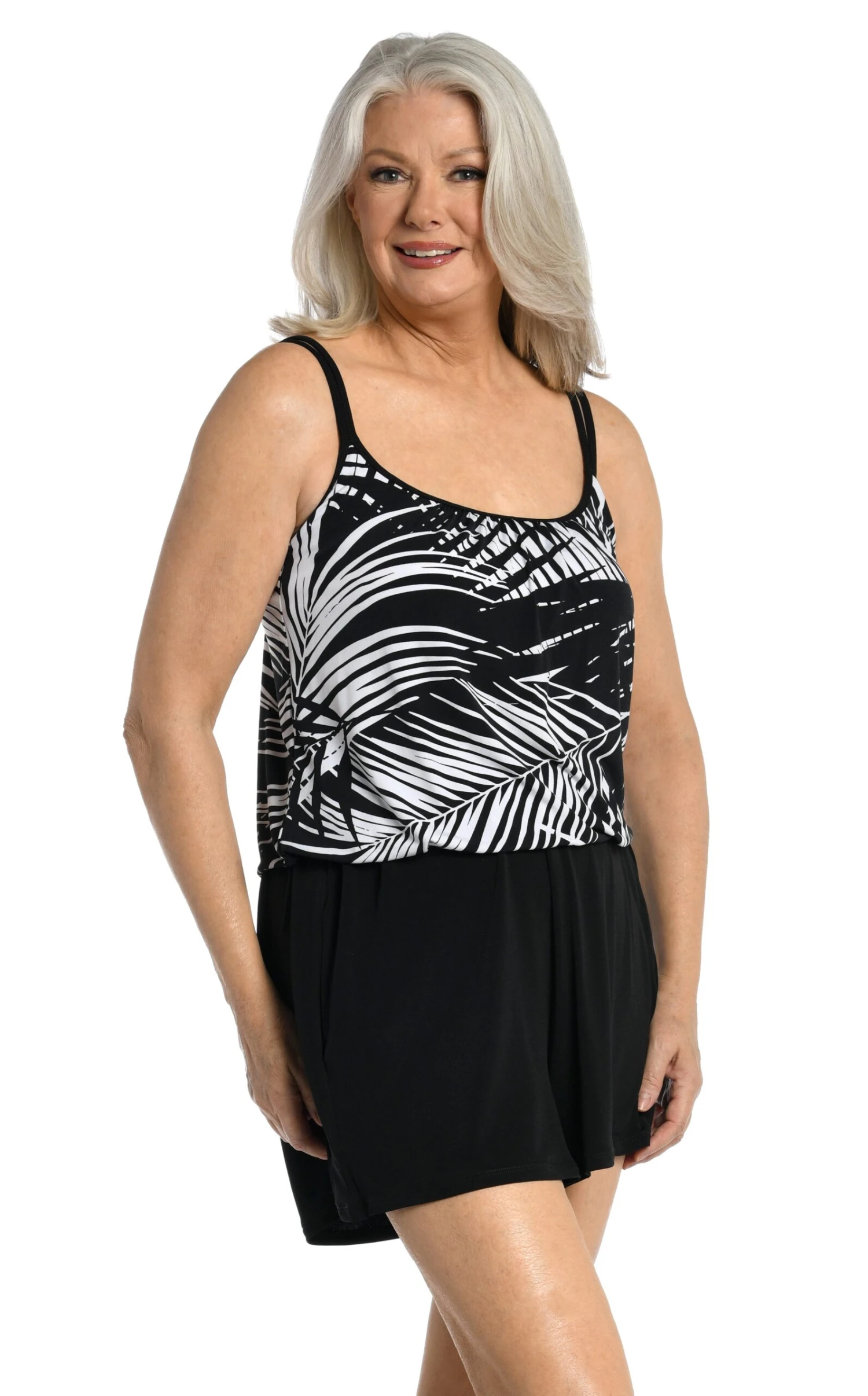 Palm fronds in black and white bring plenty of visual punch to this romper swimsuit for a sophisticated take on a tropical-inspired print. The gathered waist defines the midsection while still offering a comfortable loose fit. Double adjustable straps and molded cups provide just-right support and built-in brief bottoms give extra coverage.