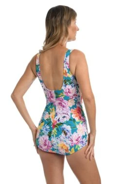 Make every day feel like a vacation in paradise with this tankini in a stylized tropical print. The loose-fitting blouson style is perfect for masking worry spots in the tummy area, while the side-tie detail adds a flirty touch. Remove the straps for a bandeau to eliminate those tan lines.
