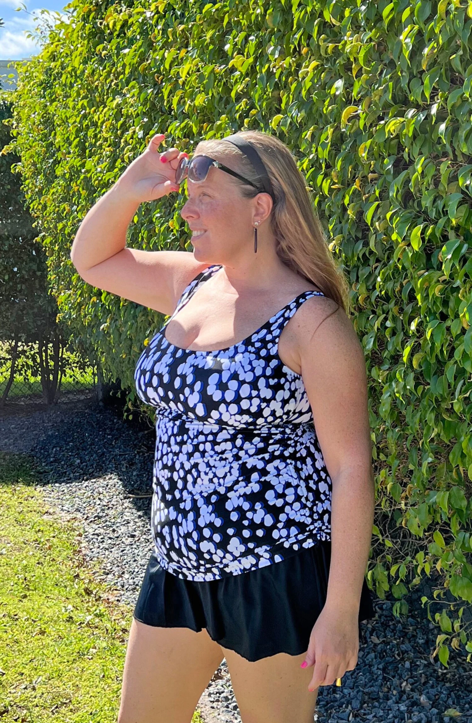 A stylized pattern with blurred edges evokes the gentle rhythm of raindrops on this swim dress. Molded cups and fixed straps provide comfortable support, while a cinch tie at the waist offers an adjustable fit. A built-in tummy toner slims and smooths for a flattering fit.