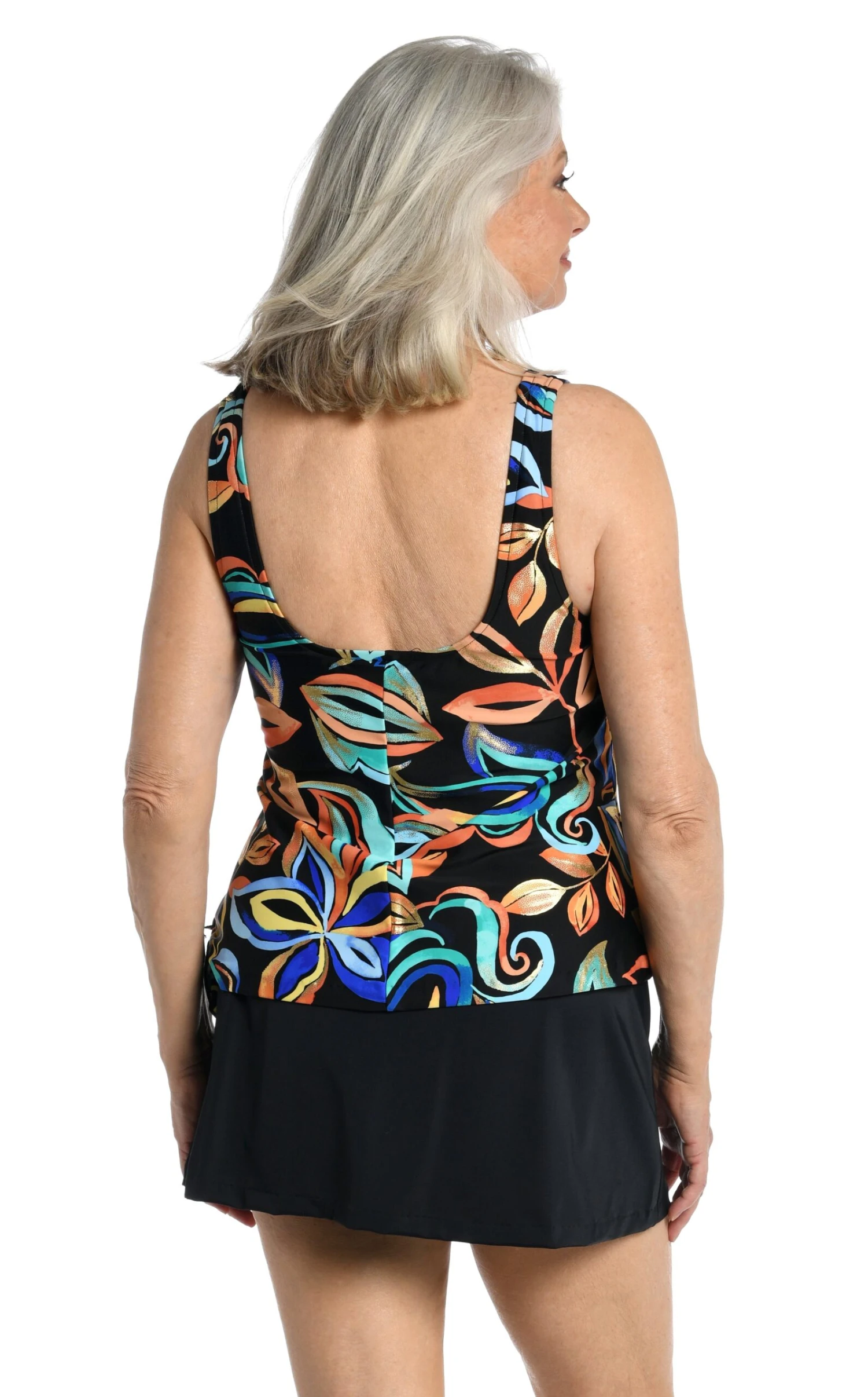 With the look of an artist’s hand, brushstroke shades of yellow, coral and blue create a painterly pattern on this one-piece swim dress. A side tie on the one-piece design creates the look of a tankini paired with a skirt. Molded cups, adjustable straps and a built-in tummy toner lift, support and smooth your silhouette.